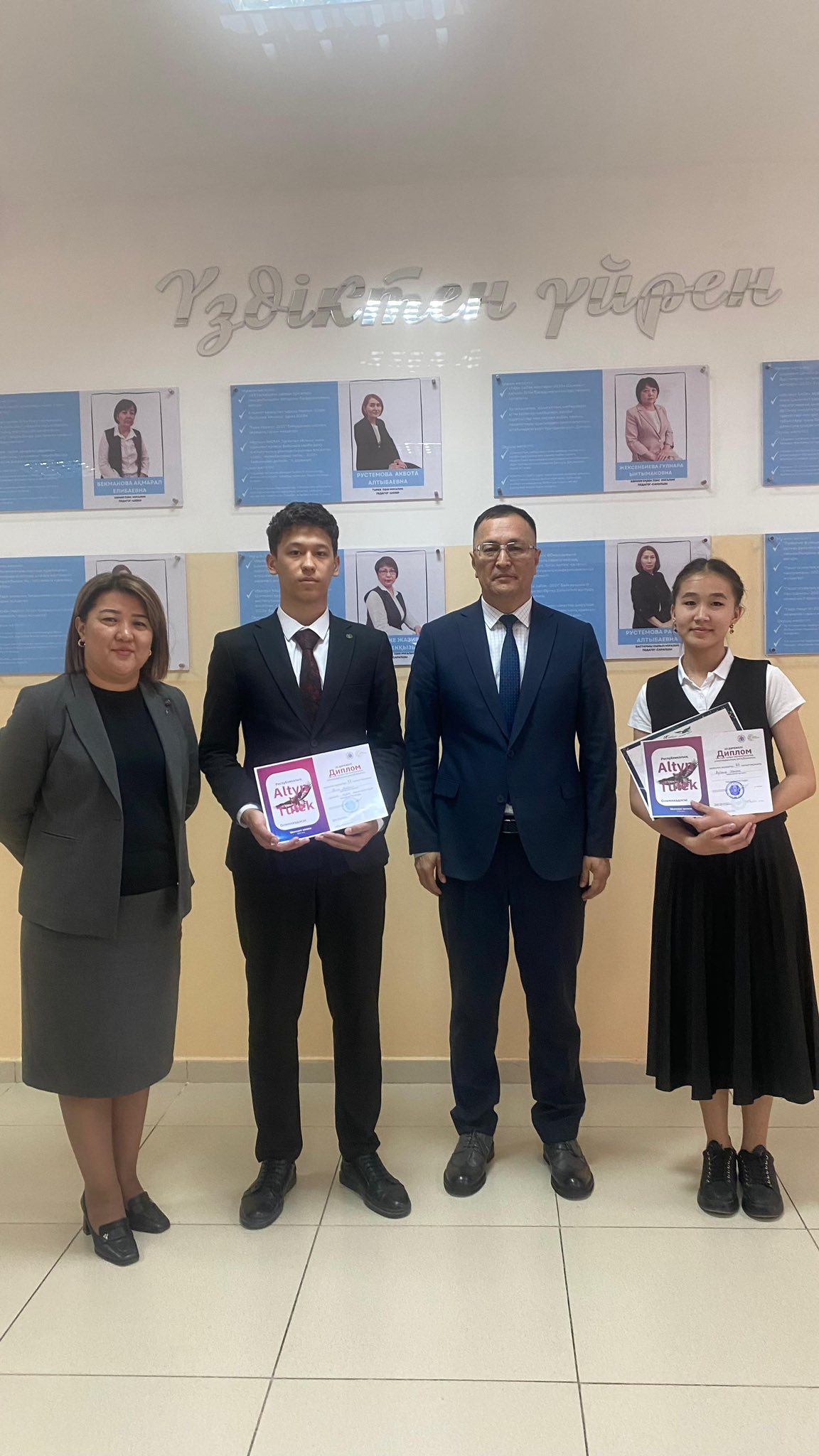 На заключительном этапе Республиканской олимпиады по математике «АЛТЫН ТУЛЕК» Ученик 11 класса ТОЛЕГЕН НУРБАКЫТ награждён дипломом III степени Руководитель: Сулеймен Ляззат Ученик 10 класса АБУБАКИР ЖАНЕРКЕ награждён дипломом III степени Руководитель: Эльчибаева Мариям НАГРАЖДЕНА.